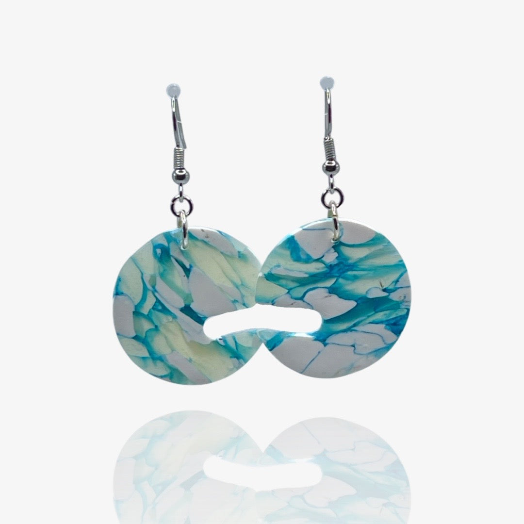 These lightweight, quirky PucMan-Ice earrings are sure to grab attention! Crafted from semi-translucent clay, they come in a fun blue and white color combo - perfect for any occasion!