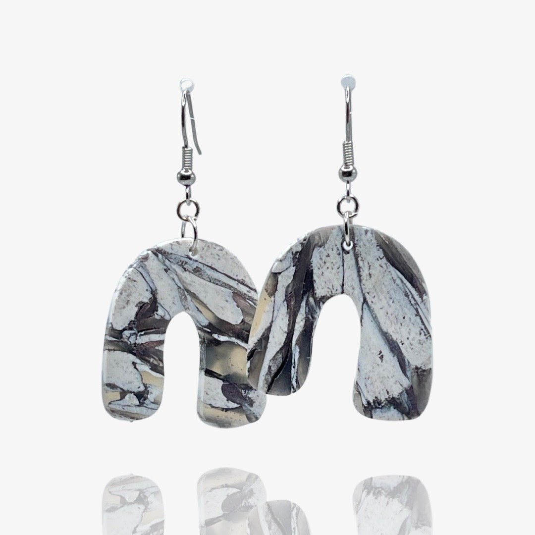Add a playful touch of style to your wardrobe with these mesmerizing Wobbly Arch - Ink earrings. Crafted with semi-translucent clay for a lightweight feel, these bold black and white earrings are sure to be the envy of everyone you meet!
